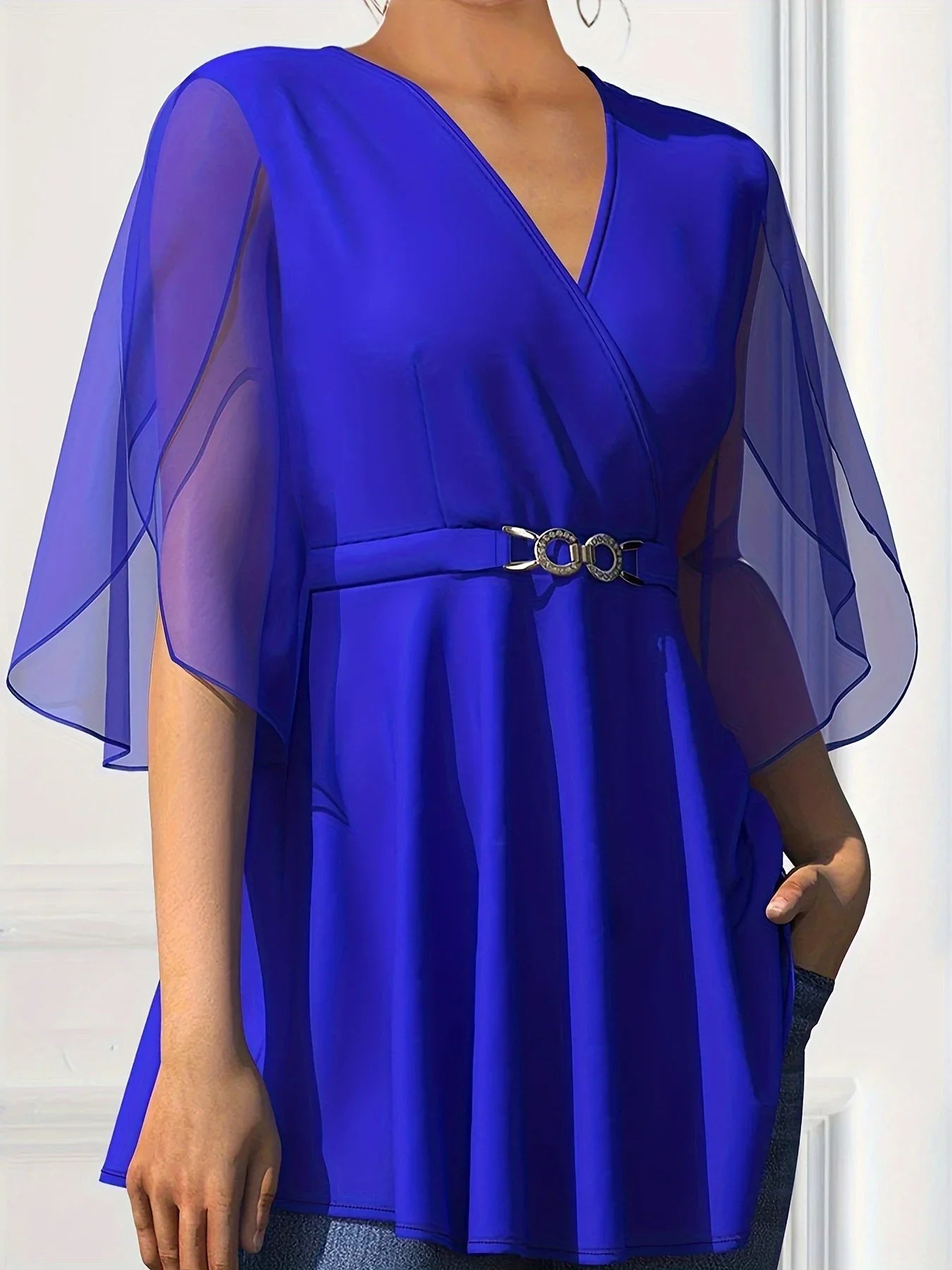 Chiffon comfort fabric, classic V-neck styling, suited to afternoon teas or evening gatherings, subtle metallic waist buckle, for anyone who favors easy sophistication
