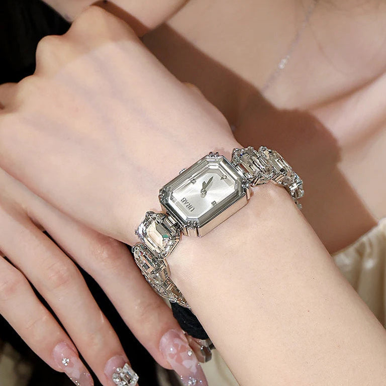 Gem-cut detailing, slim case silhouette, wearable as wrist jewelry, quartz movement for accuracy, ideal for bridal or gala looks.